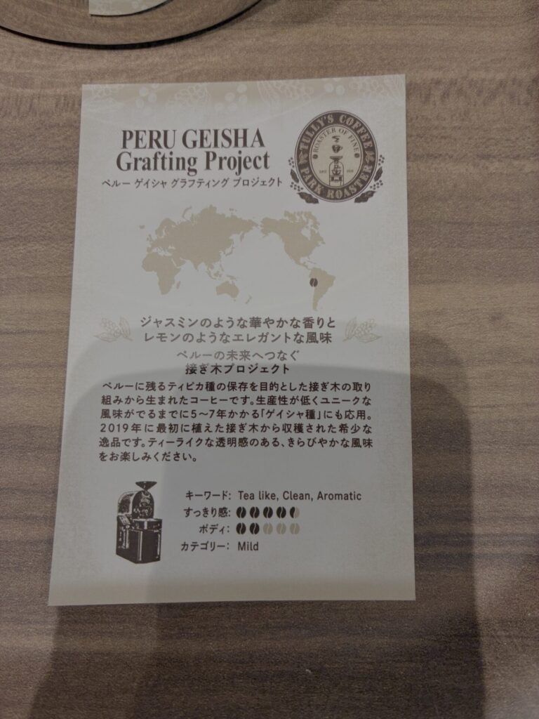 豆は2種類から選ぶことができて、このときはペルーゲイシャというコーヒーでした。